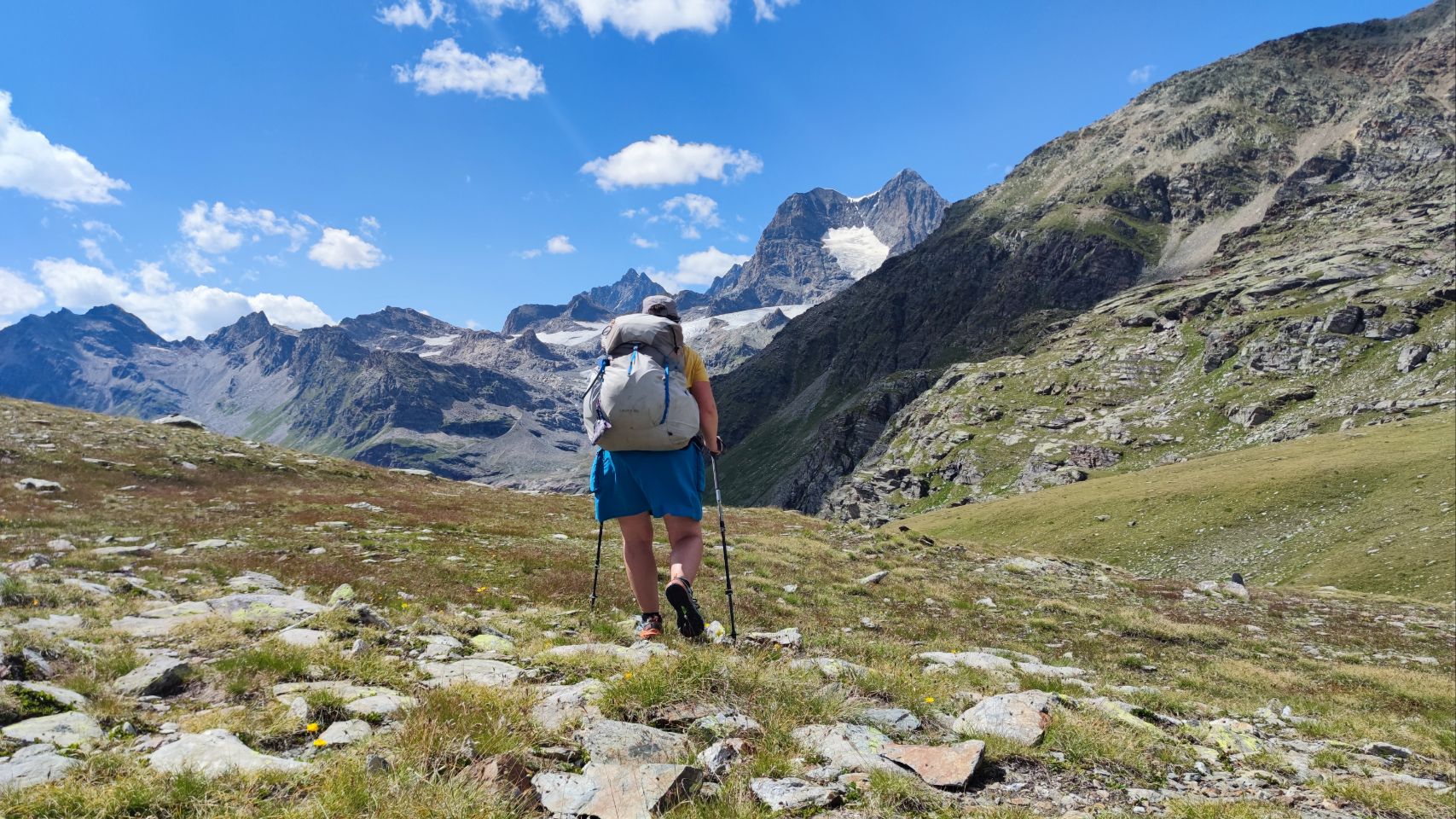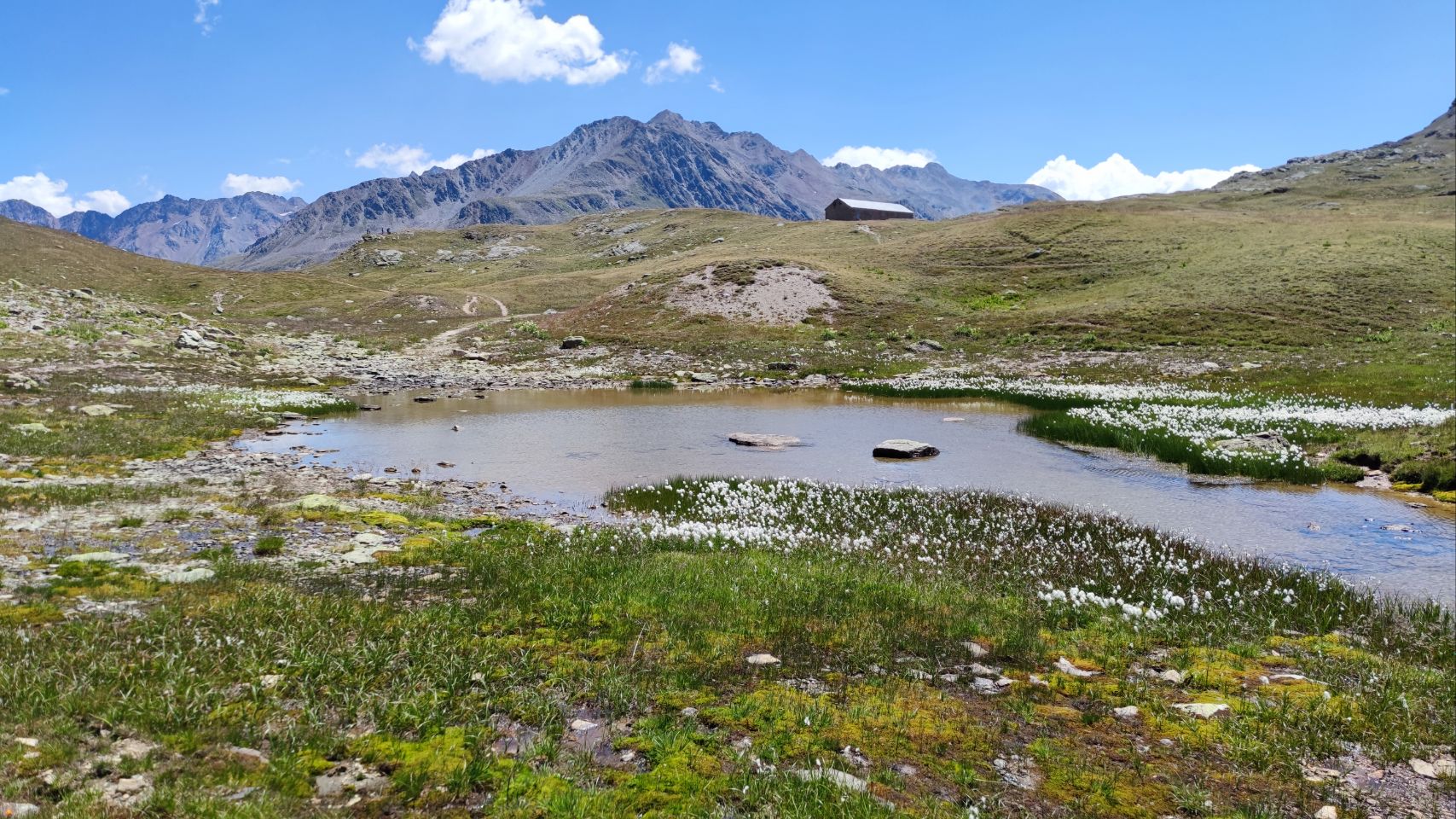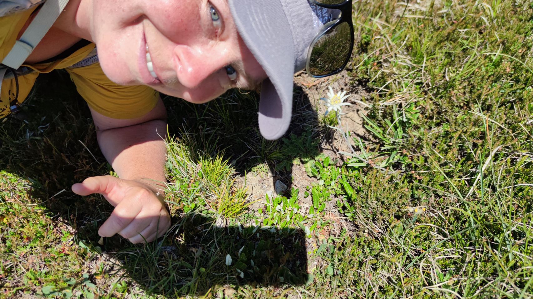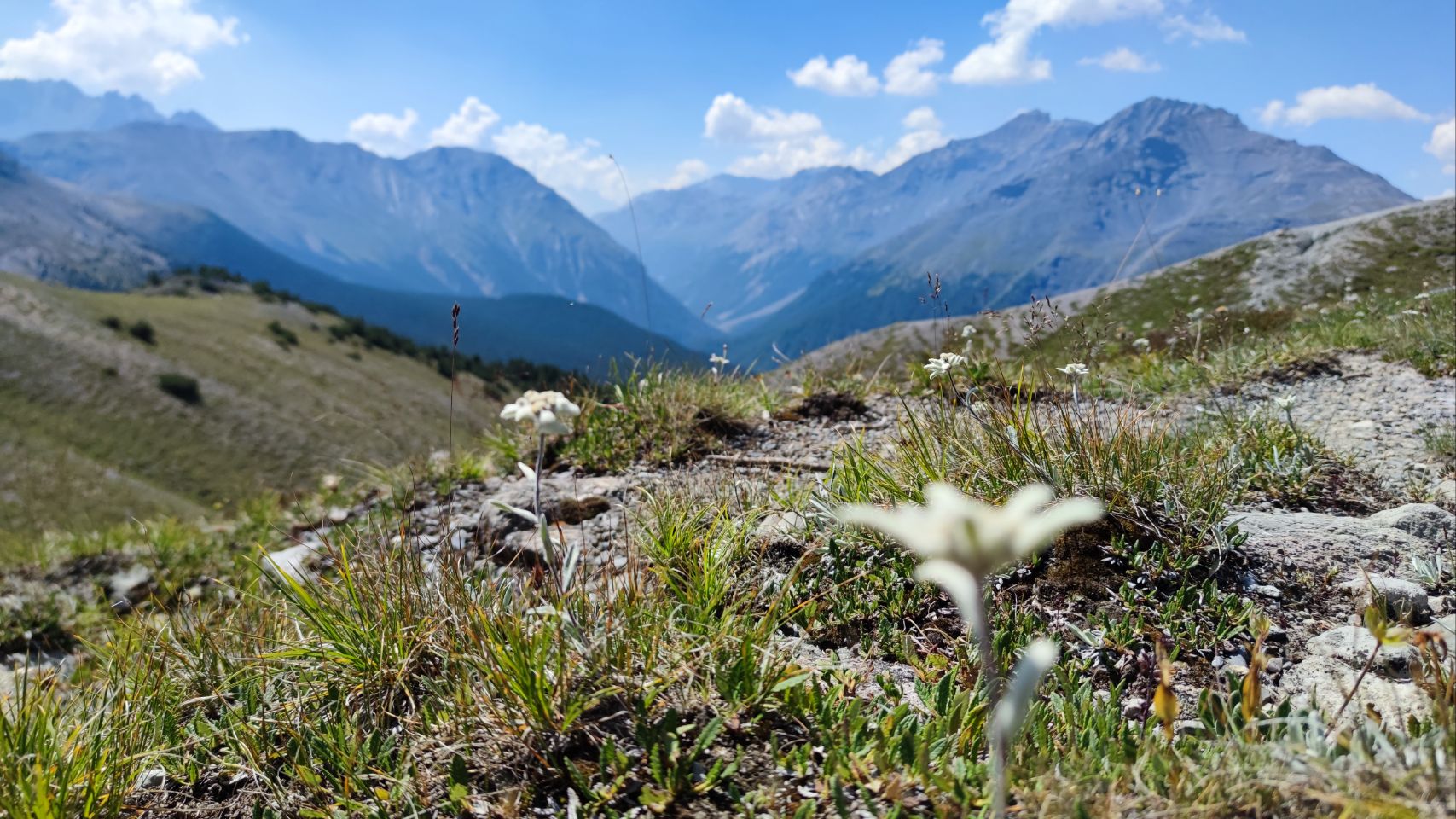 19. Juli 2022. Eine herrliche Nacht in den Bergen! Die Kühe bleiben weit weg, es ist warm genug, dass ich bei offener Zelttüre den Sternenhimmel geniessen kann. Erst gegen Morgengrauen ziehen Wolken auf und feuchten alles ein. Doch die Sonne wandert früh über den Berg und erledigt das Kondenswasser so schnell, dass man fast zuschauen kann, wie es verdampft. Die Murmeli fangen an zu pfeifen, denn schon tauchen die ersten Wanderer auf, und ich reisse mich endlich auch los. Allerdings komme ich nur langsam voran, obwohl der Weg bis zur Buffalora fast flach ist. Es hat soooo viele Edelweiss hier, und eins schöner als das andere, ich fötele und filme wie wild.