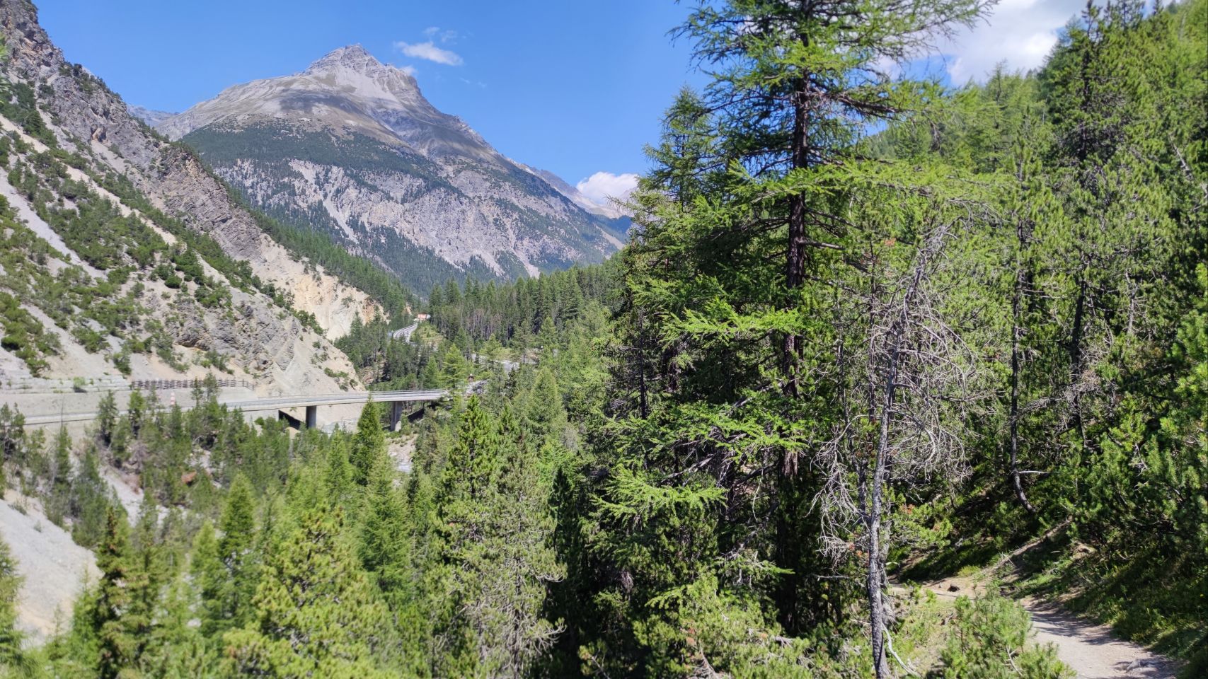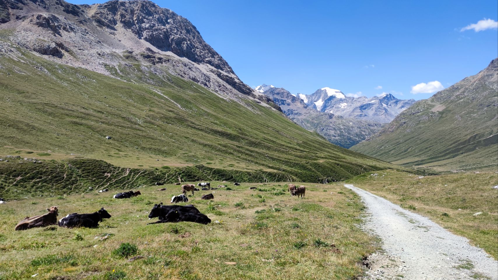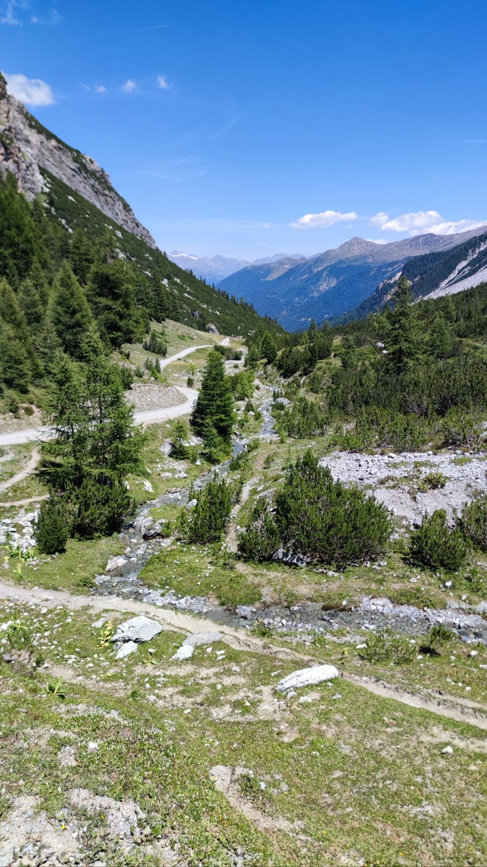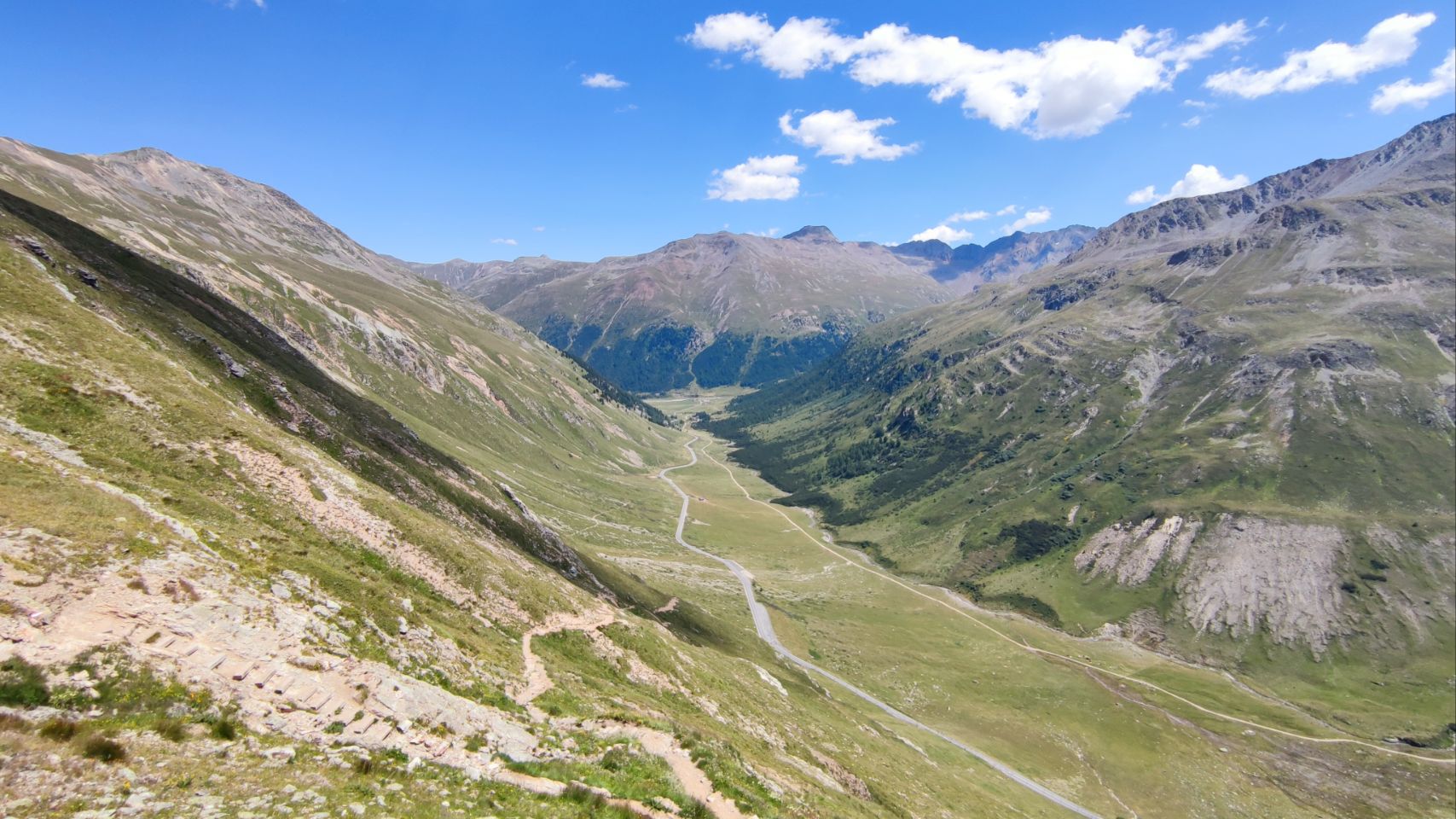 Ich biege auf einen Schotterweg Richtung Val Mora ein. Früher war dies ein wichtiger Übergang nach Italien, heute gehört das wilde Hochtal den Bikern und Wanderern, wobei einige (wenige!) Biker leider nicht viel Rücksicht nehmen auf die Wanderer, schade! Es hat nämlich genug Platz für alle hier und ist eine tolle Gravel Route. Ich versuche, mich nicht fest aufzuregen über die vereinzelten, testosterongesteuerten Idioten (gelingt mir nur mässig), und einfach die tolle Landschaft zu geniessen (das wiederum gelingt mir prima). Das Tal wirkt gewaltig gross, und so verlassen wie der Yukon, obwohl es auch vereinzelt Kühe hat hier. Mir gefällt es sehr gut, und die Murmeli grüssen auch schön 🤗. Es ist brutal heiss (ich fürchte, ich wiederhole mich), und ich bin um die vielen Brünneli froh, an denen ich meine Wasserflaschen auffüllen kann. Ich glaube, ich trinke über 4 Liter Wasser heute.
