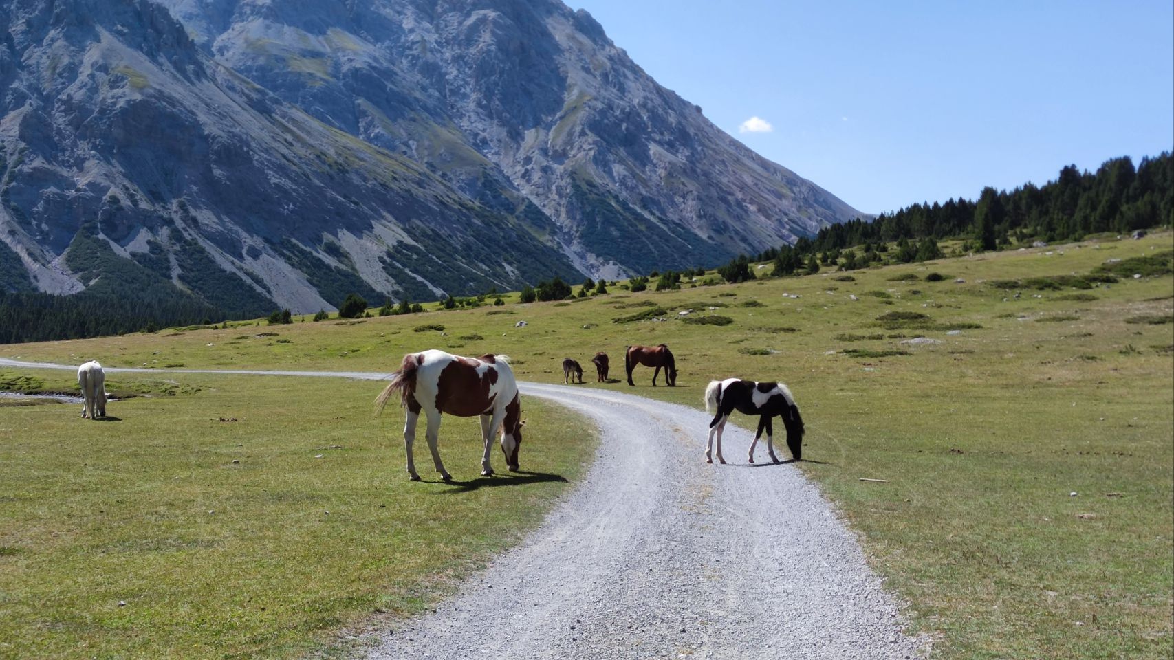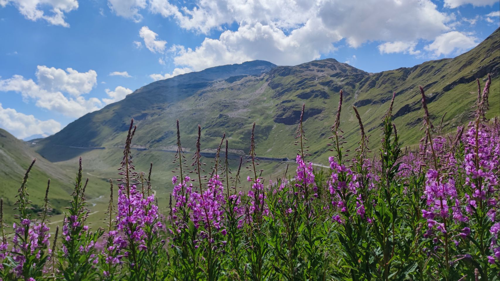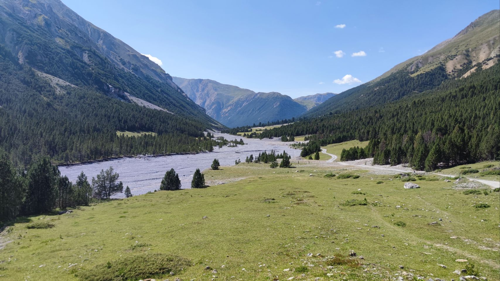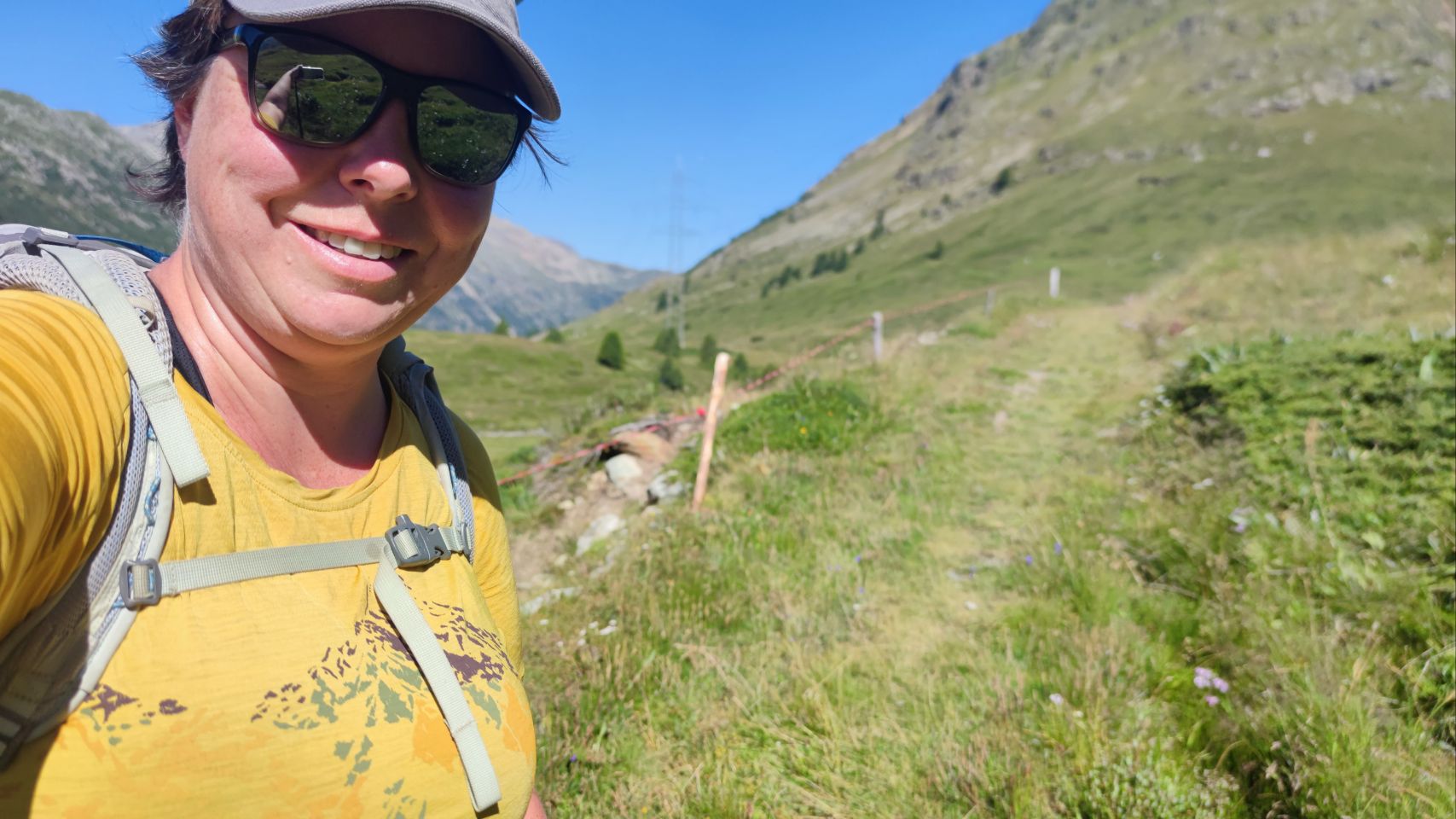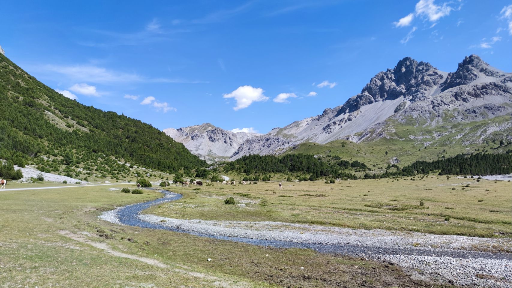 Ich biege auf einen Schotterweg Richtung Val Mora ein. Früher war dies ein wichtiger Übergang nach Italien, heute gehört das wilde Hochtal den Bikern und Wanderern, wobei einige (wenige!) Biker leider nicht viel Rücksicht nehmen auf die Wanderer, schade! Es hat nämlich genug Platz für alle hier und ist eine tolle Gravel Route. Ich versuche, mich nicht fest aufzuregen über die vereinzelten, testosterongesteuerten Idioten (gelingt mir nur mässig), und einfach die tolle Landschaft zu geniessen (das wiederum gelingt mir prima). Das Tal wirkt gewaltig gross, und so verlassen wie der Yukon, obwohl es auch vereinzelt Kühe hat hier. Mir gefällt es sehr gut, und die Murmeli grüssen auch schön 🤗. Es ist brutal heiss (ich fürchte, ich wiederhole mich), und ich bin um die vielen Brünneli froh, an denen ich meine Wasserflaschen auffüllen kann. Ich glaube, ich trinke über 4 Liter Wasser heute.