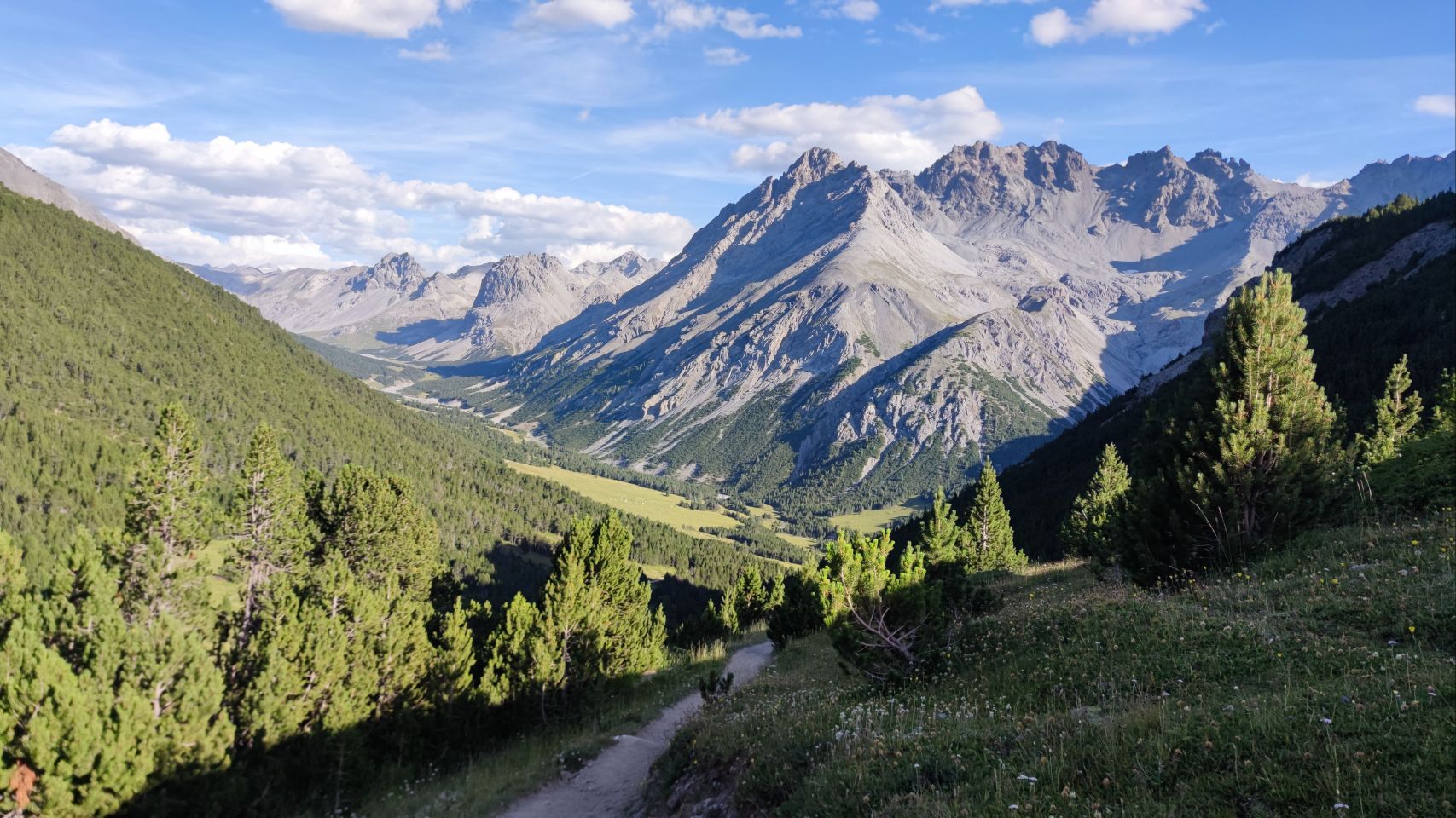 18. Juli 2022. Heute gönne ich mir ein paar richtige Kaffees, wo ich gerade in der Zivilisation bin. Den ersten gibt's gleich am Campingplatz in Müstair, dann laufe ich los, zunächst auf dem Jakobsweg nach Sta. Maria. Prompt treffe ich zwei Pilgerinnen (diese 🐚 am Rucksack sind schon ein praktisches Erkennungsmerkmal). Sie wollen vorerst mal bis Sedrun, und dann natürlich nach Santiago. Der Bündner Jakobsweg (oder "Via Son Giachen", wie er hier heisst) tönt nach einer spannenden Route, die auf meine ToDo-Liste kommt. In Sta. Maria gibt's den zweiten Cappuccino, und ein paar leckere Backwaren, bevor ich wieder in die Berge laufe.