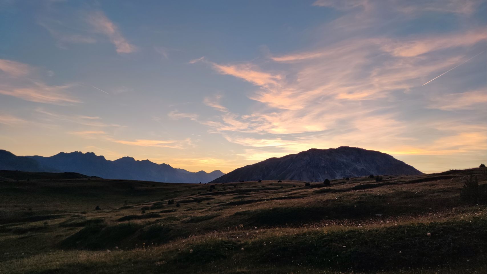Es ist schon Abend, als ich die Alp Mora erreiche, wo man mir ein herrlich kühles Bier serviert. Ich frage nach einem guten Biwakplätzli, und die Sennerin gibt mir ein paar Tipps, wo es keine Kühe hat. Ich steige noch etwas auf bis zu einer Hochebene und finde einen schönen Platz. Das Kuhgebimmel ist weit weg, hoffentlich bleibt das so. Ich sehe in der Ferne ein Reh, sogar ein Edelweiss finde ich noch kurz vor Sonnenuntergang. Herrliche Abendstimmung während ich mein Vegicurry koche, und ich kann mir glatt vorstellen, wie hier Bär und Wolf rumstreunern. (Aktuell hat es keines von beiden, aber die Sennerin von der Alp Mora hat erzählt dass sie beides schon hier gesehen haben). Was für ein schönes Ausklingen des Tages! Müstair - Alp Mora, 22 km