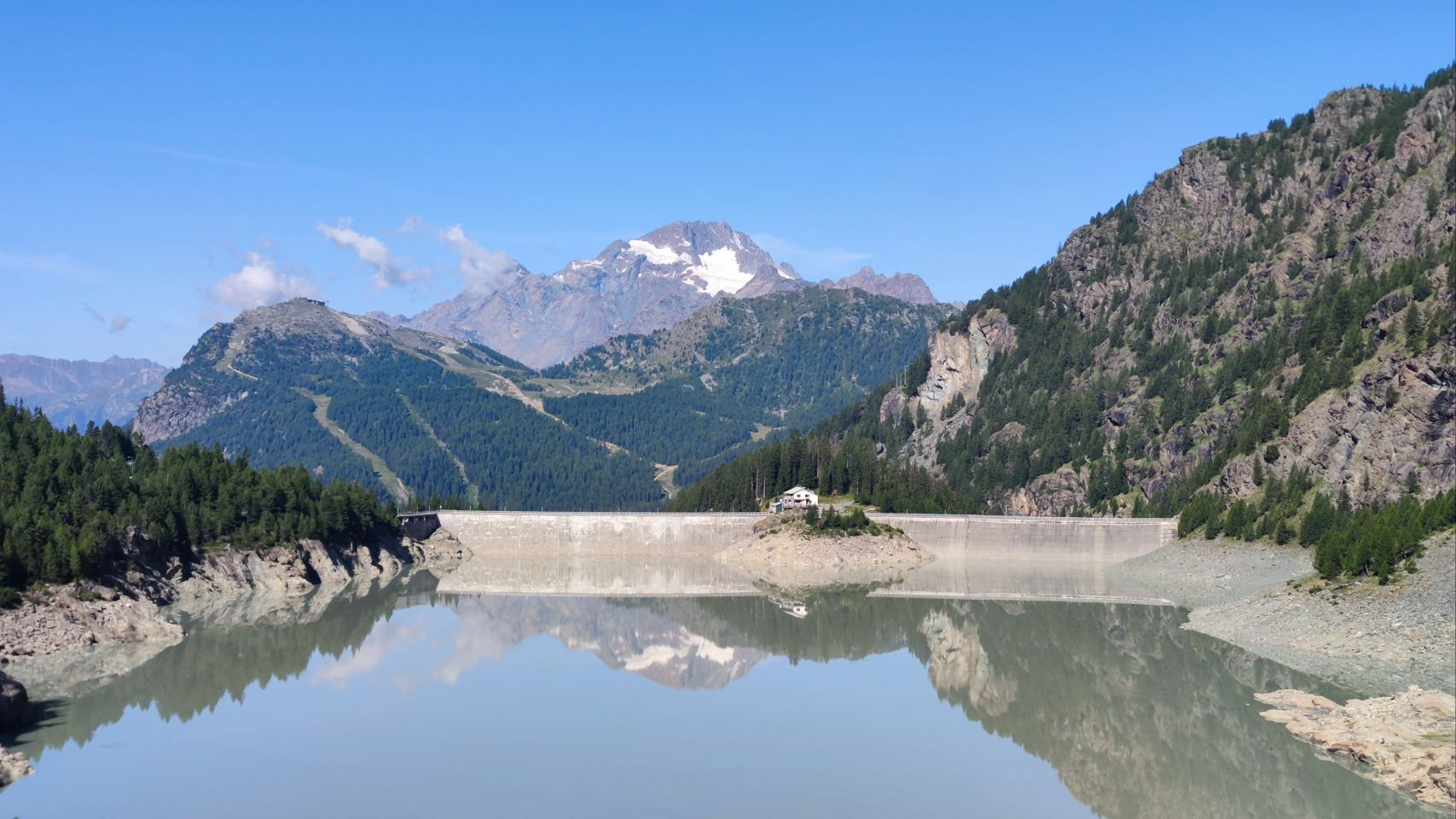 Hier weht endlich ein kühler Wind von den Gletschern vor mir. Was für eine Aussicht! Da mache ich endlich mal richtig Pause und geniesse die Rückseite des Piz Palü. Der Abstieg geht dann ganz leicht, über die hübsche Alp Gembré, wo gerade die Ziegen gemolken werden. Bald bin ich am oberen Stausee und schaue auf den unteren Stausee und das Valmalenco hinunter. Zwischen den Seen hat es einen schönen Picknickplatz mit Zaun - ruhige Nacht garantiert, keine Kühe! Ich schlafe noch bei Tageslicht ein, so müde bin ich. Cavaglia - Lago Campo Moro, 23 km