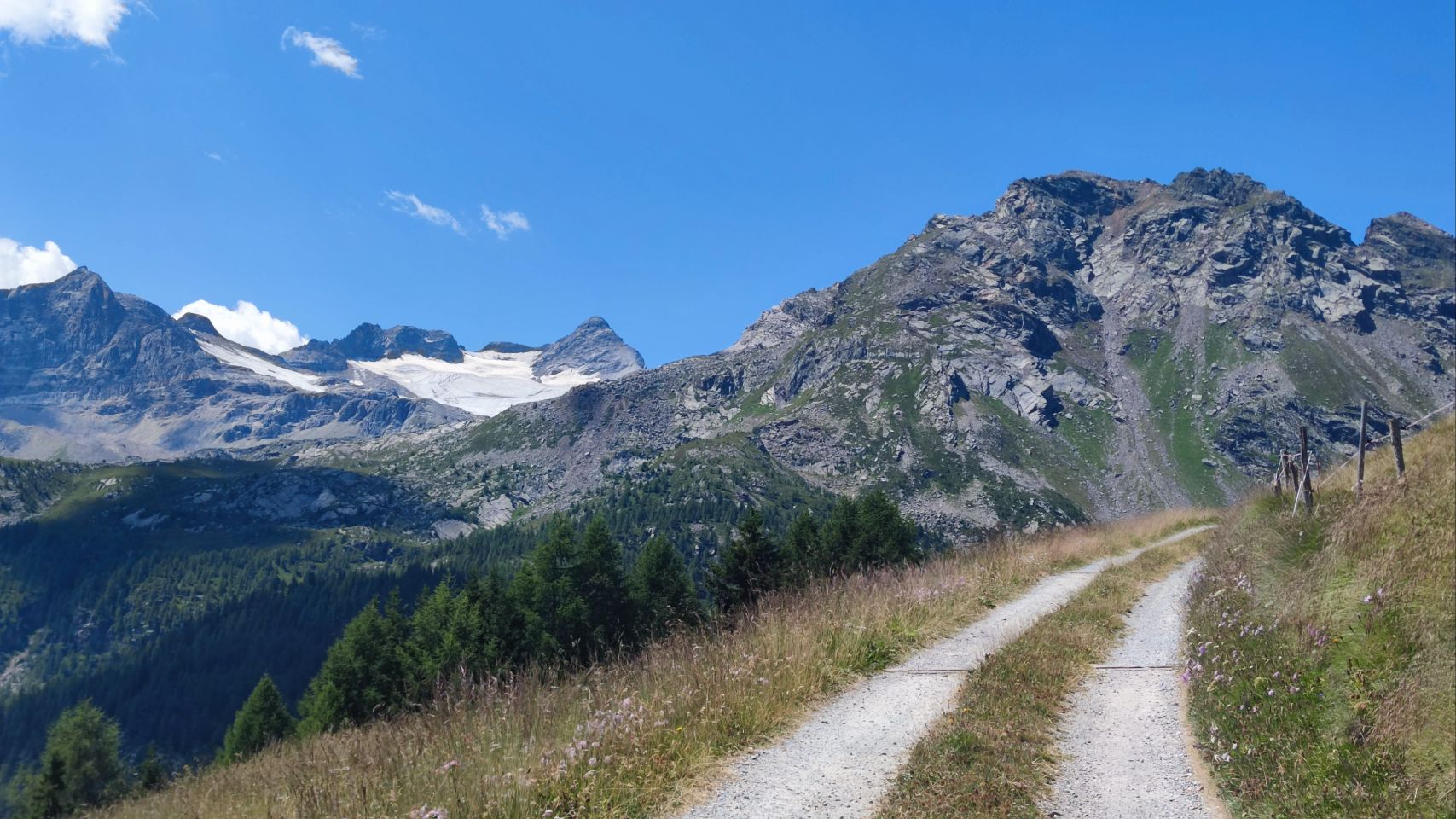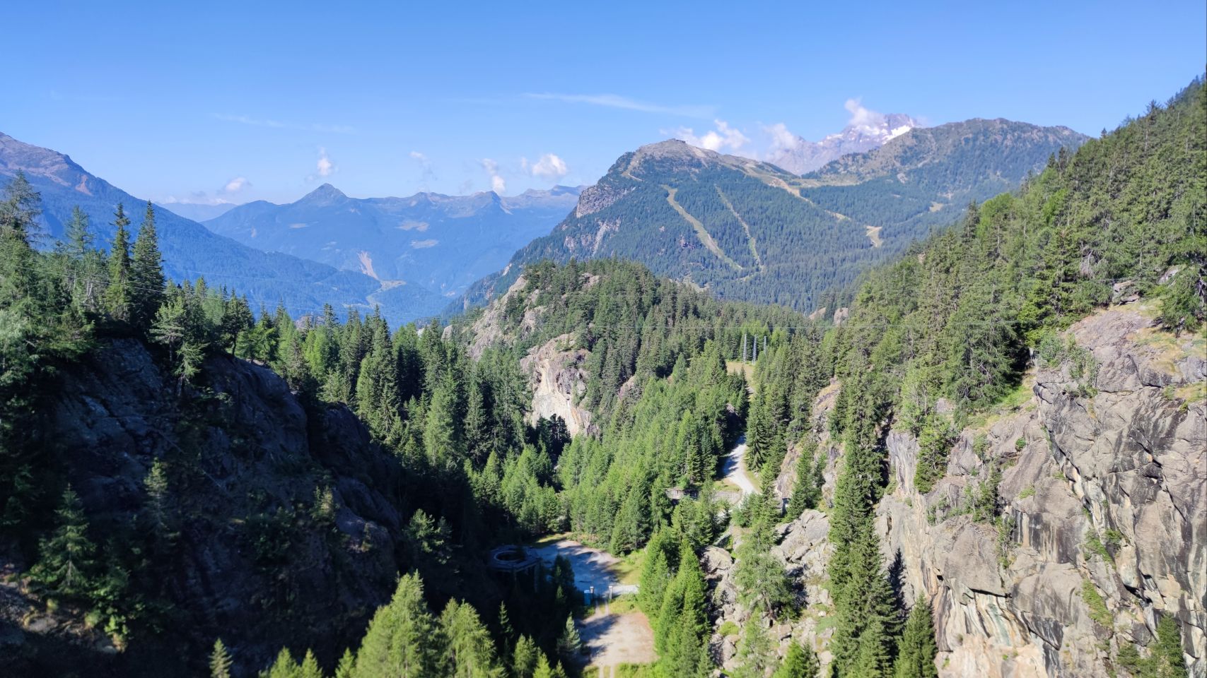 Etwas weiter unten, beim Gletschergarten, finde ich dann einen gemütlichen Picknicktisch für meinen Nescafé (seufz). Ich schaue mir die Gletschermühlen noch an, bevor ich dem Höhenweg Richtung Passo Confinale in Angriff nehme. Heute ist es leider schon früh sehr heiss und ich schleppe mich im 🐌Tempo dahin. Zum Glück geht es anfangs noch durch den Wald, und die Heidelbeeren versüssen mir den Weg.