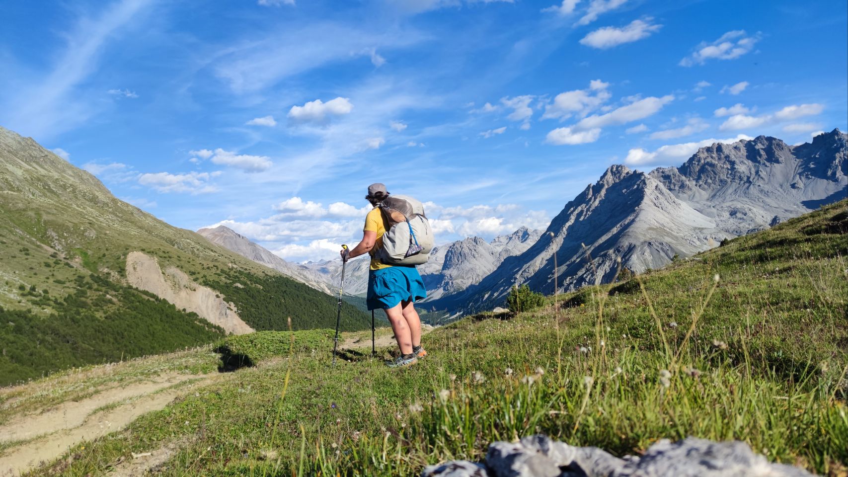 17. Juli 2022. Der Campingplatz in Morteratsch liegt lange im Schatten, es ist kalt am plätschernden Bach. Ich bleibe zu lange liegen... as usual. Am Schluss muss ich wieder rennen, um das Postauto zur Diavolezza noch zu erwischen, und vergesse mein Handtüechli 😢. Ab der Talstation Diavolezza geht es zu Fuss weiter Richtung Livigno. Der Weg ist einfach und gemütlich, ich drehe mich immer wieder um für das herrliche Panorama auf die Bernina-Gruppe und die Diavolezza.
