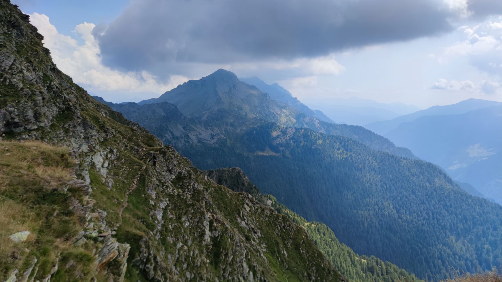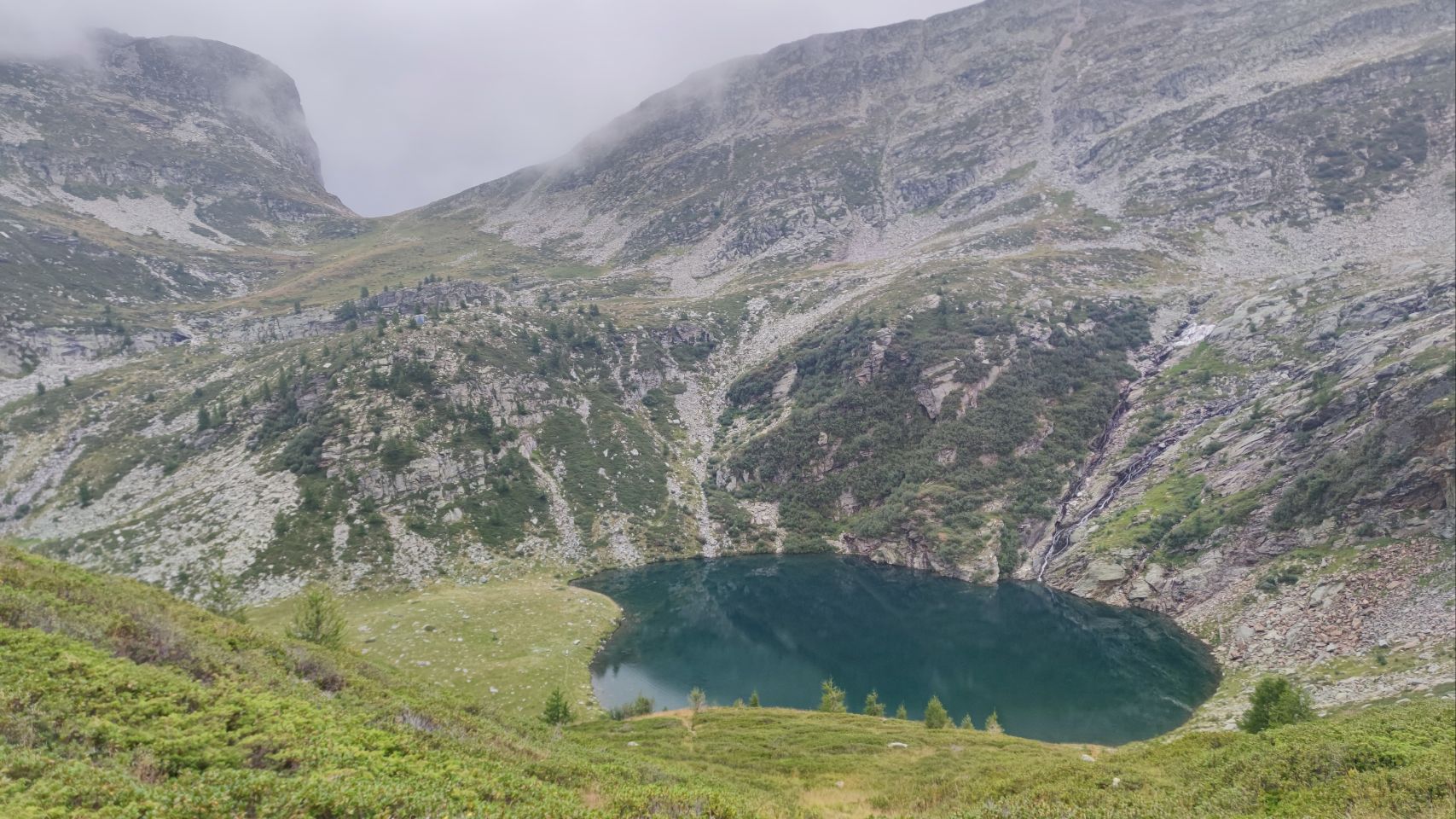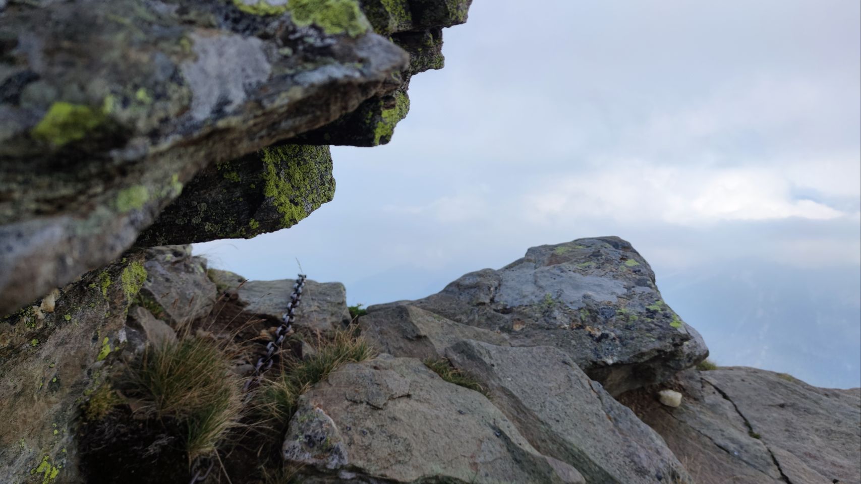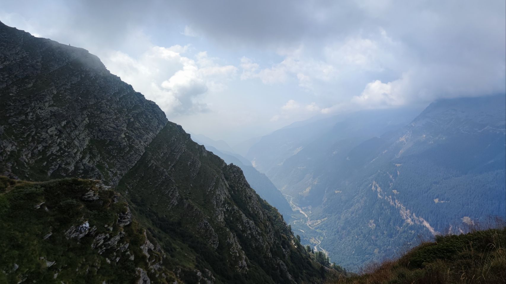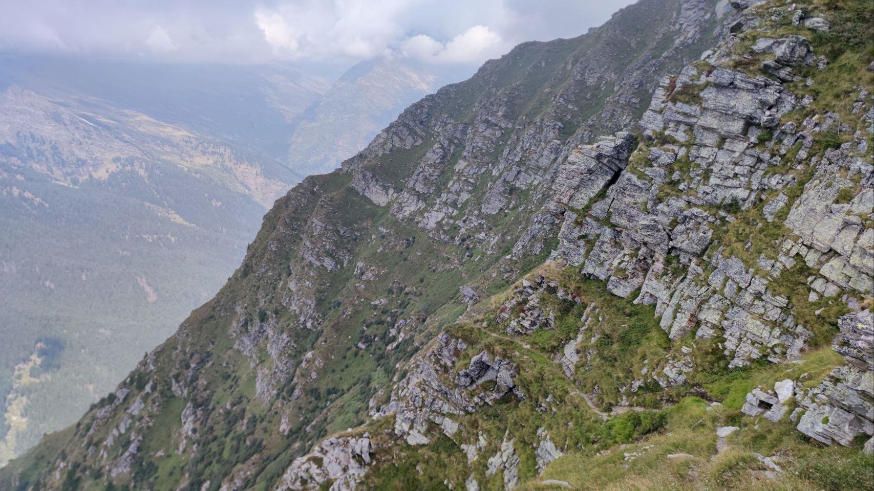 Bald bin ich auf der Alp Trescolmen. Das ist nun das dritte Jahr in Folge, dass ich auf dieser schönen, wilden Alp bin. 2020 mit Sven hier biwakiert, 2021 auf der Via Alpina überquert und heute laufe ich endlich weiter auf dem Sentiero Alpino. Aus dem Bad im See wird wieder nichts, denn es ist kühl und neblig. Der Weg windet sich hoch über dem Calanca-Tal am steilen Hang entlang, dazwischen gibt es immer mal wieder kurze Ketten- und Kletterpassagen.