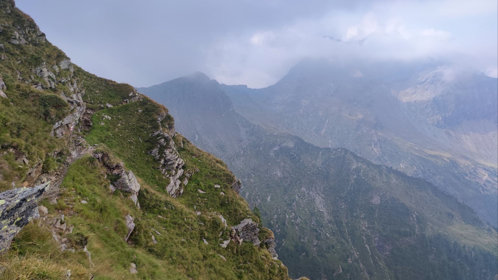 11. August 2022. Ich schlafe zwar gut, aber es ist heiss im Schlafsaal, und ich erwache irgendwie gerädert. Die Hütte liegt im Nebel, als ich aufbreche. Zunächst führt der Weg wieder bergauf zum Buffalora-Pass, wo mitten auf dem Wanderweg im nassen Gras ein älterer Herr im Schlafsack liegt und sich nicht von den vorbeilaufenden Wanderern stören lässt beim Ausschlafen. Ich bin ein bisschen verwundert, denn es hat geregnet nachts und er muss pflotschnass sein. Mein Weg führt weiter den steilen Grashängen entlang, hier darf man nicht stolpern oder auf dem feuchten Weg ausrutschen. Zwar hat es an den meisten tückischen Stellen Ketten und einmal auch eine steile Eisentreppe, dennoch erfordert der Weg viel Konzentration und ich bin furchtbar müde (der Kaffee auf der Hütte war leider nicht so toll, wie meistens).