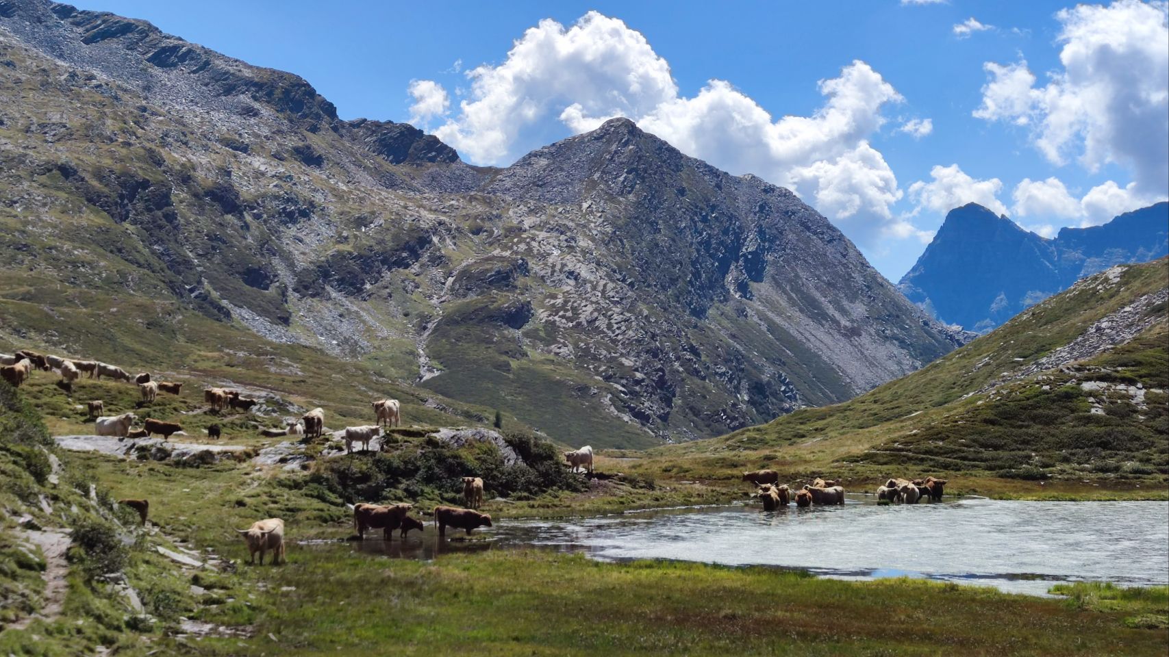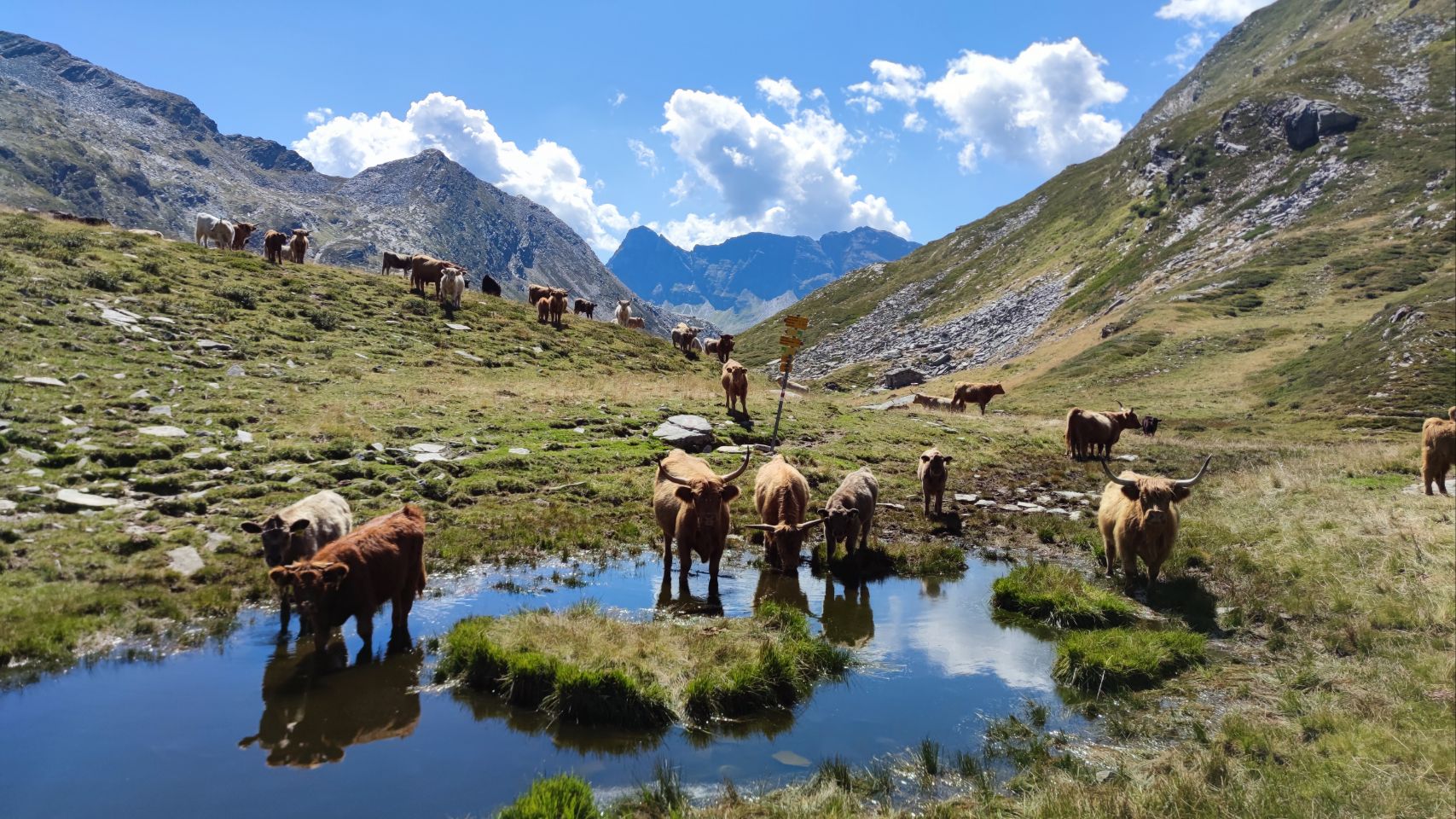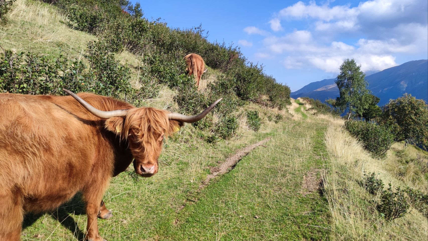 Auf dem Pass di Passit weidet eine Herde Hochlandrinder, mit allerherzlichsten, kuscheligen Jungtieren - und wachsamen, langhörnigen Mamas sowie einem riesigen Stier. Daher mache ich einen grossen Bogen, auch wenn es alles sehr idyllisch wirkt, wie die Kühe da im See die Hufe kühlen. Der Aufstieg zum Pass de la Cruseta ist schnell geschafft, herrliche Aussicht im schönsten Abendlicht! Hinten runter ist allerdings Konzentration gefragt, an Ketten geht es kurz fast senkrecht über die Felsen runter.