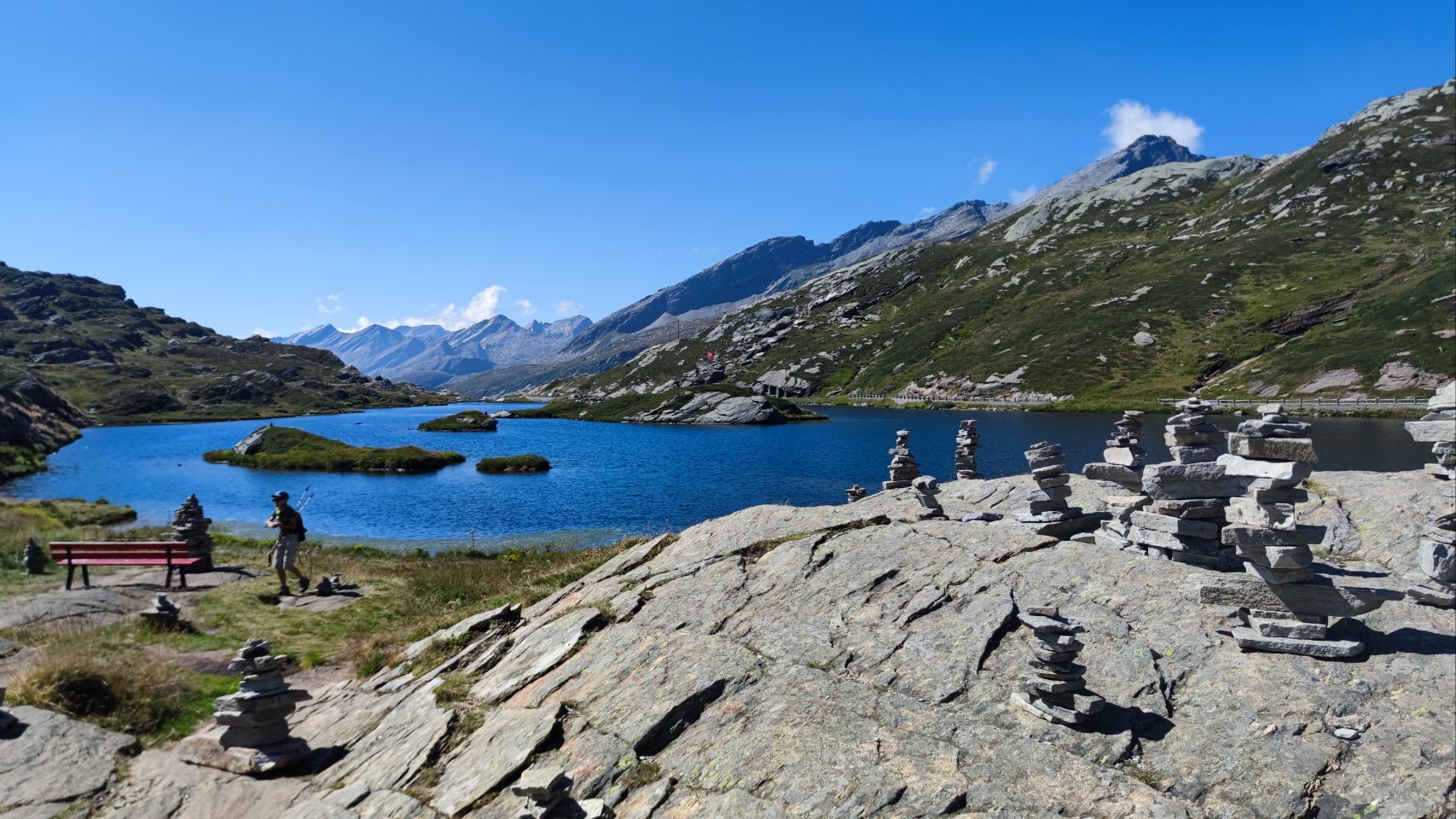 9. August 2022. Bei strahlendem Sonnenschein und dröhnendem Motorenlärm starte ich um 11 Uhr auf dem Bernardino-Pass zum Sentiero Alpino da Calanca. Hübsche Steintürmchen geben einen ersten Eindruck von der kommenden Felslandschaft.