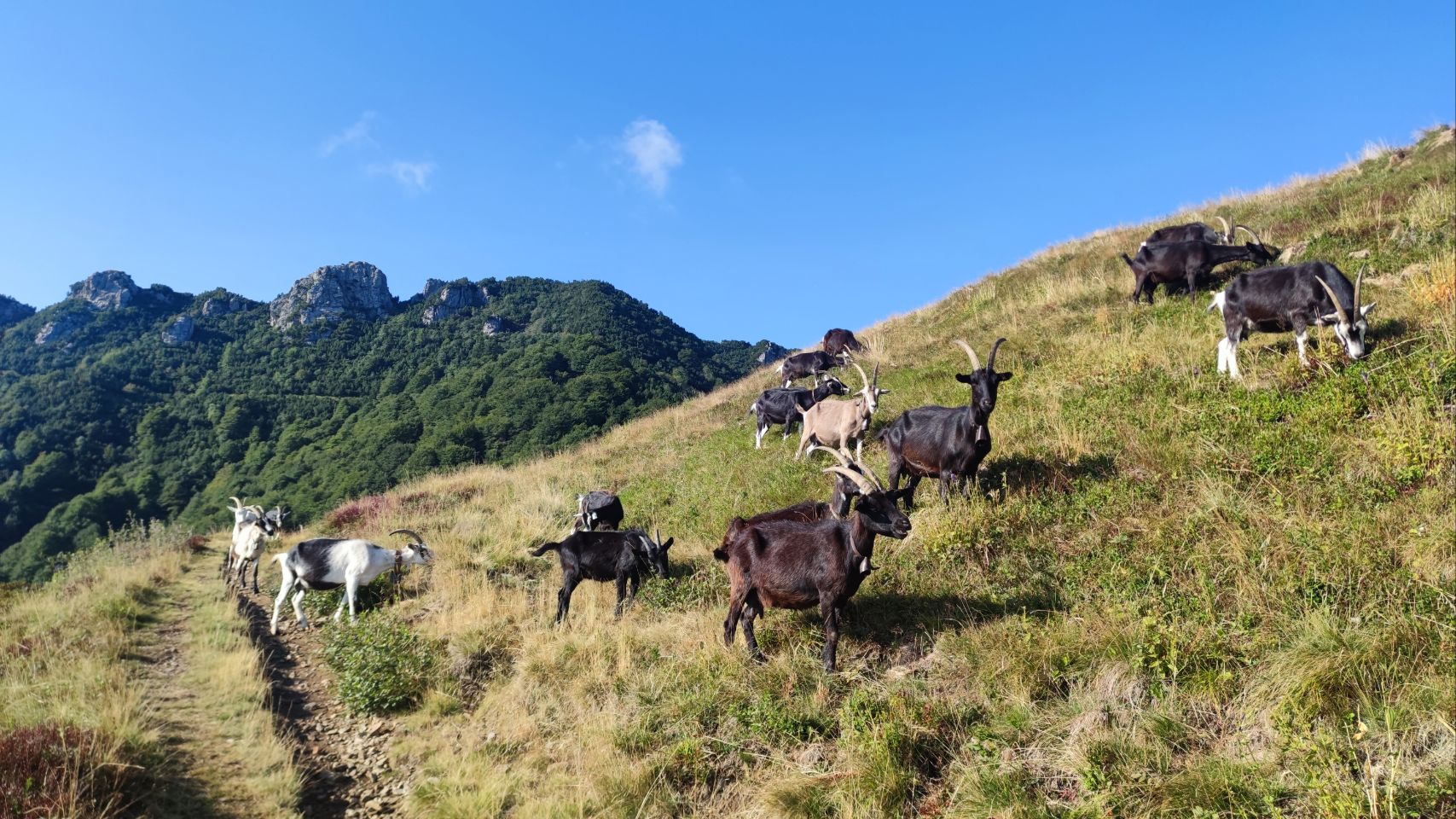 Daher beschliesse ich bei der ersten Alp, wo gerade eine herzige Ziegenherde weidet, vorzeitig abzusteigen ins Tal. Ein schöner lauschiger Waldweg führt an mächtigen Felsen vorbei über winzige Alpen (mit Eseli!) in endlosen Serpentinen hinunter ins heisse Calanca-Tal. Dort finde ich zum Glück eine kleine Bar, wo es einheimisches Glacéund Bier gibt, und ich meine Beine strecken kann bis das Postauto kommt. Capanna Buffalora - Cauco, 17 km