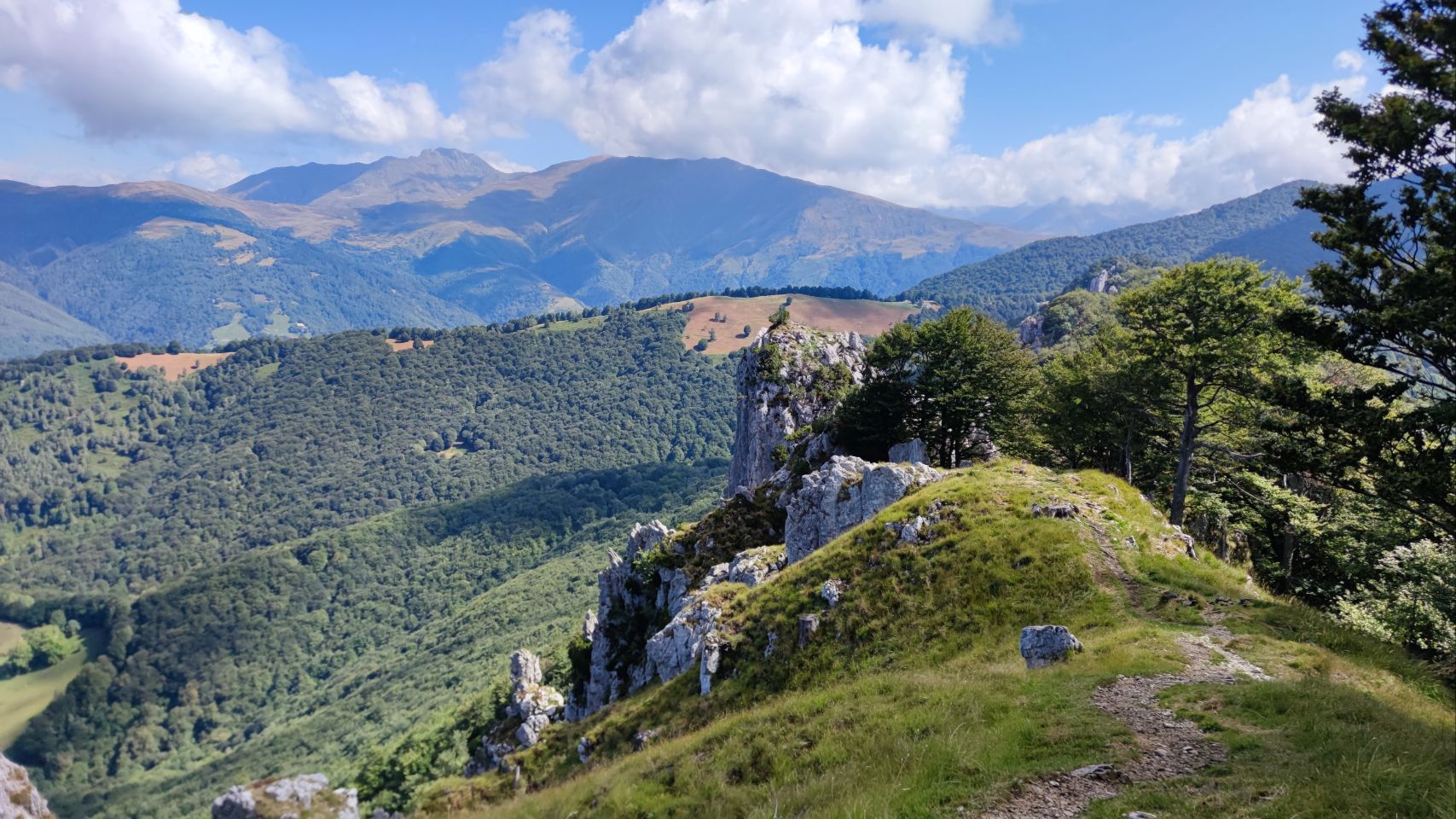 Das Wetter ist heute wankelmütig, die Sonne scheint immer nur kurz, dann wird es gleich heiss, fünf Minuten später ist es wieder kalt und neblig. Der Weg wird immer luftiger, hier ist nix mehr mit vor sich hin träumen beim Laufen, Konzentration ist gefragt. Aber ich finde eine herrliche Klippe mit Aussicht für mein Picknick.