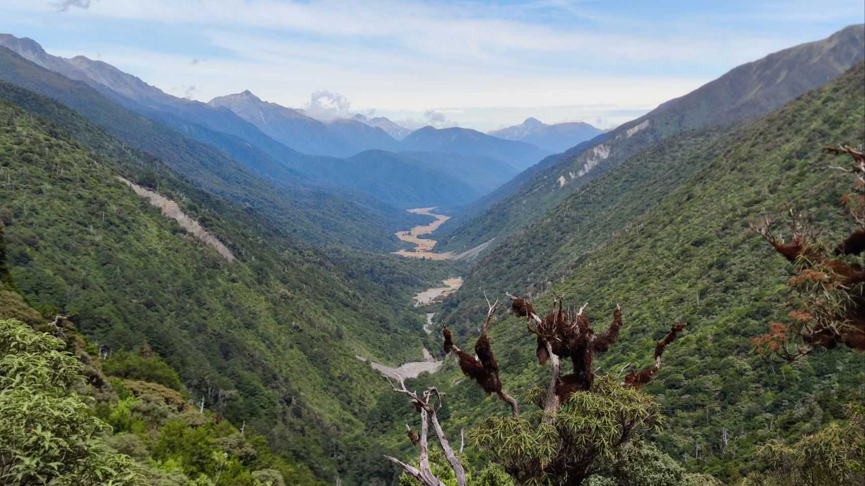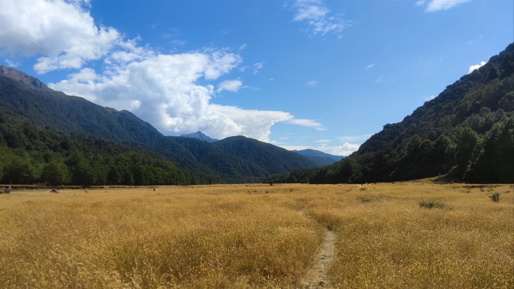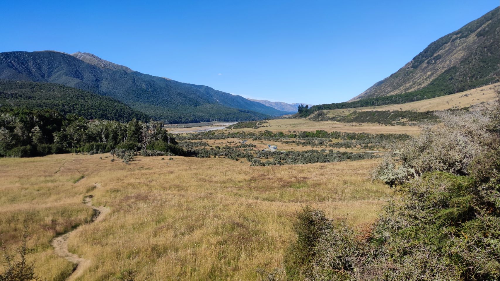 Dafür frühstücke ich ganz gemütlich und breche erst gegen neun auf. Da ich auch heute nur etwa 6 Stunden wandern will, ist keine Eile angesagt. Die ersten paar Kilometer geht's gemütlich durchs hohe Gras, dann verschwindet der Wanderweg im Wald, wo er auch für den grössten Teil des Tages bleibt. Ich überquere einen Pass mitten im Wald, laufe hoch über einem wahrscheinlich wunderschönen See, ohne ihn zu sehen. Der Weg macht auch heute viele unnötige Höhenmeter, doch ich bin entspannt heute und nerve mich nicht. Nur die vielen Wespen im Wald nerven langsam. Heute erwischt mich auch eine, als ich sie versehentlich unter dem Arm einklemme. Endlich öffnet sich der Wald und ich stehe am Ufer des Lake Sumner. Leider ist es nicht sehr anmächelig zum Baden, denn das Ufer ist ganz schlammig und seicht. Heute ist es nämlich ziemlich heiss. Der Weg führt aber gleich wieder in den Wald. Der nächste Abschnitt ist nicht mehr sehr lustig, es geht durchs Dickicht, über und unter vielen umgestürzten Bäumen hindurch. Der Weg ist kaum sichtbar und die vielen Wespen sind hier wirklich nicht hilfreich, wenn man kaum sieht, wo man den Fuss abstellt. Irgendwann gebe ich auf, schlage mich zur Kuhweide durch und laufe auf der flachen Wiese in der Talsohle. Warum man den Weg nicht hier durch führt, ist mir schleierhaft. Dafür knallt hier die Sonne und bald geht mir das Wasser aus. Nicht so schlimm, bald komme ich an den Fluss. Eine riesige Hängebrücke führt über den Hurunui River. Nun ist es nicht mehr weit bis zur Hütte. Ursprünglich wollte ich noch weiter und bei einer heissen Quelle zelten, aber ich bin erschöpft von der Hitze und die Hütte ist gross und schön - und sie hat Fliegengitter, so dass man die Fenster öffnen und den kühlen Wind reinlassen kann. Gebongt, ich bleibe. Bisher ist nur Mathieu da, ein Franzose, den ich heute erst getroffen habe. Später taucht noch Theo auf, ebenfalls ein Franzose, den ich schon in St Arnaud kennengelernt habe. So gefällt es mir, drei Leute in einer 15-Betten-Hütte. Da kann man ganz dekadent sein und zwei Matratzen nehmen zum schlafen 🤗.